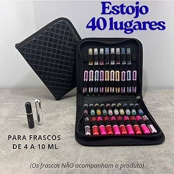 Acompanha 1 kit: Kit Estojo com 40 Amostras Spray – Cabe Frascos de Vidro de 4ml a 10 ml – Preta (Personalizado) + 10 perfumes Originais 5 femininos e 5 masculinos + 10 Contratipos 5 femininos e 5 masculinos + 20 amostras.